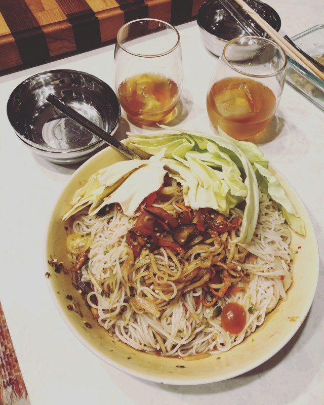Homemade Laos papaya noodle salad with some whiskey on the rocks. Damn, that’s too good!